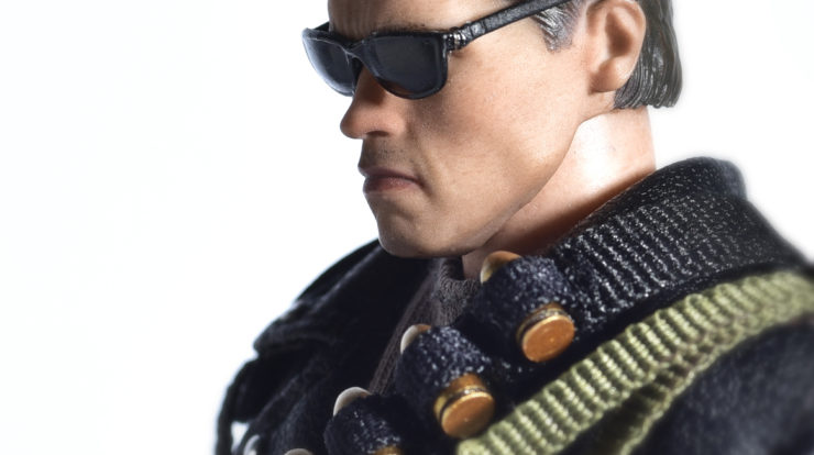 The hyper-realistic collectible figure features a head sculpt with a hand painted likeness of actor Arnold Schwarzenegger in his appearance as “T-800”, mounted atop a magnetic neck which enables flexible rotation for the head, for optimum poseability.