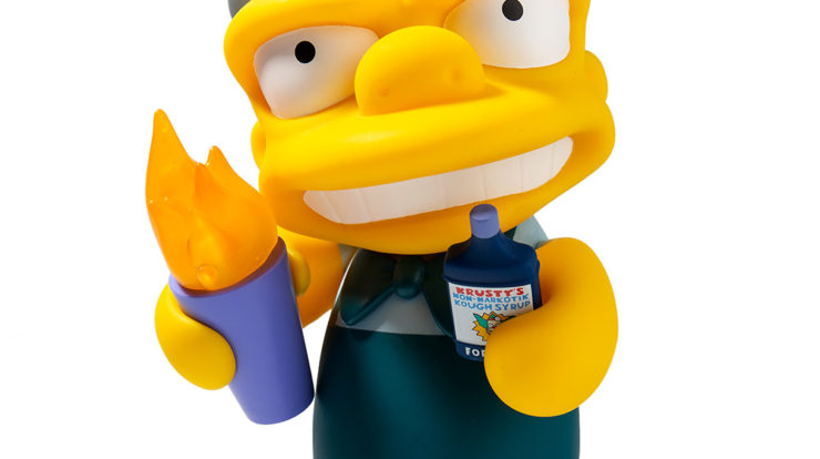 t’s time to slide into your favorite bar stool at Springfield’s most recognized watering hole because it’s about to get lit! Everyone’s favorite bartender Moe is ready to light up your collection with the all new The Simpsons Flaming Moe’s Moe Art Figure by Kidrobot. First appearing in 1991 on The Simpsons Season 3 episode titled “Flaming Moe’s” this the Flaming Moe drink took Springfield by storm. This collectible figure pays homage the to one of the greatest tv shows ever, a 30 year history that paved the way for the future of pop culture and this year broke records becoming the longest-running scripted series in TV history. Standing approximately 7” tall and coming complete with a Flaming Moe and his secret ingredient (“plain, ordinary, over-the-counter children’s cough syrup”) this crusty bartender is a must have for any fan of The Simpsons! Get yours today or look like Hugh Jass!