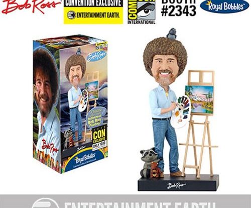 Entertainment Earth have shared their newest SDCC exclusive – a bobble head of everyone’s favorite painting instructor, Bob Ross. Bob Ross is joined by his pet bird, raccoon, and squirrel, as well as a removable easel with a choice of 5 different Bob Ross paintings. Each Royal Bobble comes with its own unique serial number located on the bottom of the base to indicate authenticity. This SDCC exclusive Bob Ross bobble head measures about 10 1/4-inches tall x 5 1/2-inches long x 4 3/4-inches wide.