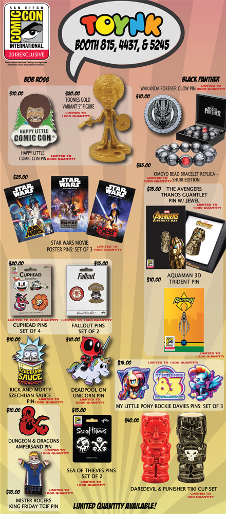 Our friends over at Toynk Toys sent over details of their 2018 SDCC exclusives today. From pins to tiki mugs to vinyl figures – there’s a wide range of products on tap this year from Toynk. You’ll be able to find them at the show at booths #815, #4437 and #5245. The exclusives are listed below.