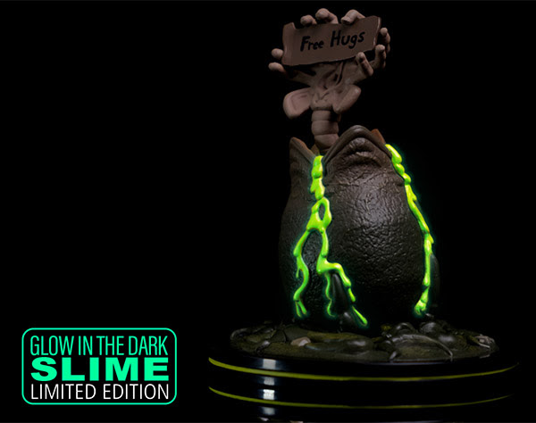 But in our version of the Xenomorph, he’s just this side of adorable as he emerges from his egg, oozing glow-in-the-dark green slime. About 3.5 inches tall and sitting on an alien terrain base, the face hugger is holding a “Free Hugs” sign, letting you know that murderous alien parasites need love too.