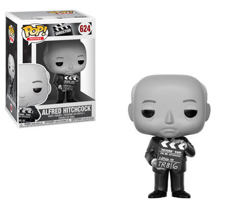 In a black and white color scheme, Alfred Hitchcock will be available this fall as a Pop! vinyl figure holding a movie clapboard for Psycho, arguably his best-known film.