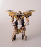 The package’s slip cover front features Bumblebee standing with a boombox – music is a huge theme that runs through the packaging. Flipped over, the box reads like the liner notes for a casette showing the A-side and B-side contents. The music theme continues as the slip cover is removed and a cassette-like box is revealed. Bumblebee is prominately displayed in the package’s window. Both Dairu and Uruaz are stored in a slide-out drawer, which is equally cool. You can see the package below.