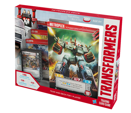 - METROPLEX Deck – The METROPLEX Deck contains the cards for one player to bring the Titan METROPLEX into the TRANSFORMERS Trading Card Game experience. It features the METROPLEX, SCAMPER, SIX-GUN, and SLAMMER character cards and a 40-card deck of battle cards including three battle cards–Rally the City, Height Advantage and Protected by Metroplex—not available in the AUTOBOTS Starter Set or the TRANSFORMERS Trading Card Game Booster Packs. The METROPLEX Deck will be available for purchase at retailers in the United States beginning on Nov. 21, 2018, and in certain other markets later in 2018.
