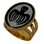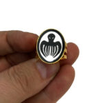 Created after exhaustive and careful study of reference materials from the EON Productions archives to ensure maximum accuracy, each Factory Entertainment replica SPECTRE ring is meticulously handcrafted in 14K yellow gold over solid sterling silver, with the recessed black enamel SPECTRE insignia accented by polished rhodium. An invisible layer of clear enamel protects the octopus motif so that the surface is smooth and durable. The underside of the ring is solid backed with a screen accurate split-style shank. The ring weighs approximately 16 grams.