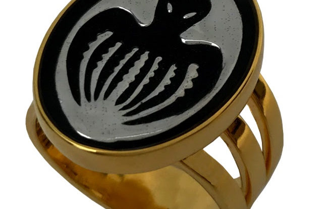 The prop rings were constructed as practical props by a costume jeweler and a decision was made to set the black octopus emblem on a light background, presumably for greater clarity and to better standout on camera. Contrary to popular belief, the setting was not mother-of-pearl. This belief was the result of studio lighting, making the highly-polished silver color appear as a brilliant white.