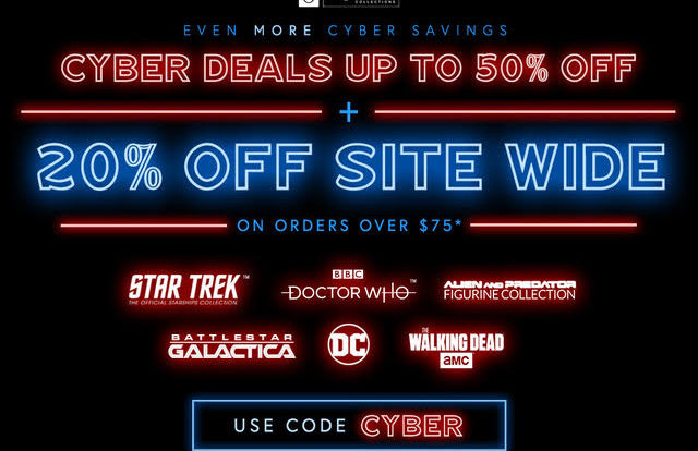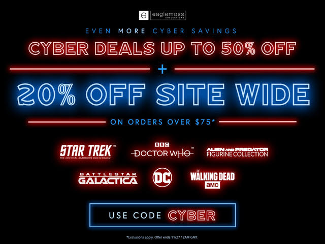 You might have noticed your inbox was blown up today, being “Cyber Monday” and all. Of the mails I read was a note from my pals at Eaglemoss Hero Collector about their Cyber Sale. It’s are marked down as much as 50% off with an extra 20% off with the code CYBER. The sale includes many items typically excluded from such promotions, like the Star Trek Shuttle Sets 2-4, all Battlestar Galactica ships (including the Galactica itself), all Star Trek: Discovery Starships and all Star Trek XL Edition Starships. It’s their biggest sale ever, and it’s a great way to grab some cool collectibles for everyone on your shopping list…which includes yourself.