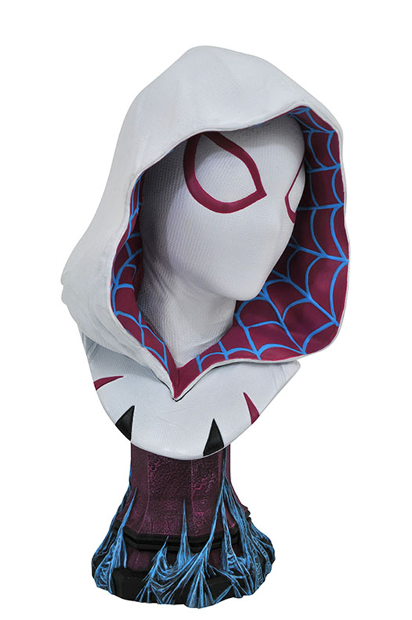 A Diamond Select Toys release! The Ghost Spider strikes! The breakout spider-hero breaks into the Legends in 3 Dimensions line as the newest half-scale resin bust. Measuring approximately 10 inches tall atop a webbed-up pillar base, Spider-Gwen is limited to only 1,000 pieces, and comes packaged in a full-color box with a certificate of authenticity. Designed by Joe Allard, sculpted by Joe Menna! (Item #DEC182510, – SRP: $150.00)