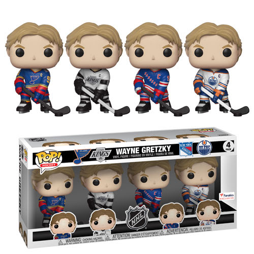 The Great One, Wayne Gretzky, holds an astonishing number of records in professional hockey so it is only reasonable that he is now immortalized as a Pop! vinyl in the Pop! Hockey line. He is available as a single Pop! in his LA Kings jersey or in a Fanatics exclusive 4-pack which captures his 20-year on-ice career (the Kings, the Oilers, the Rangers and the Blues).