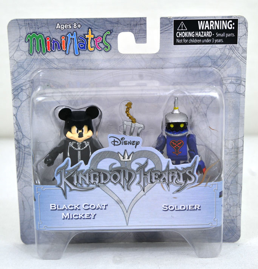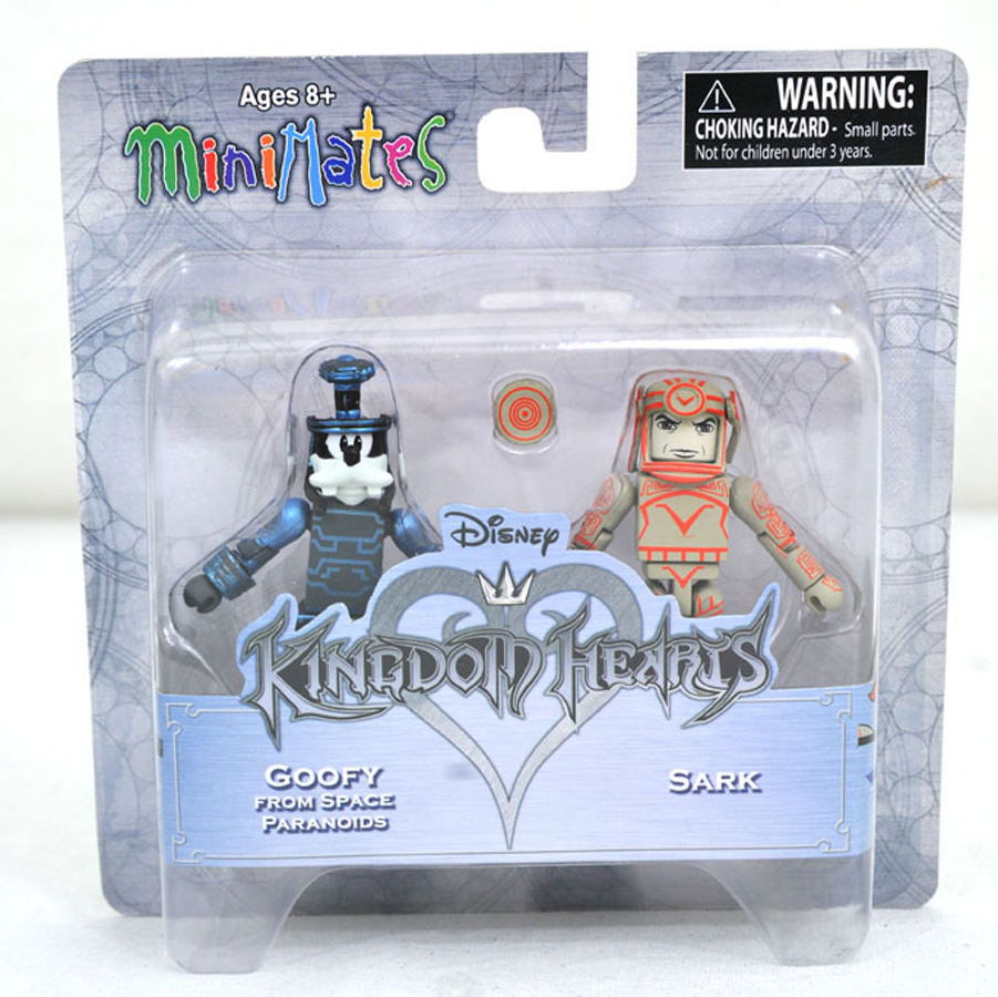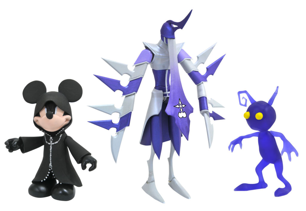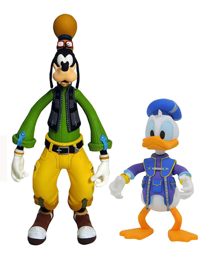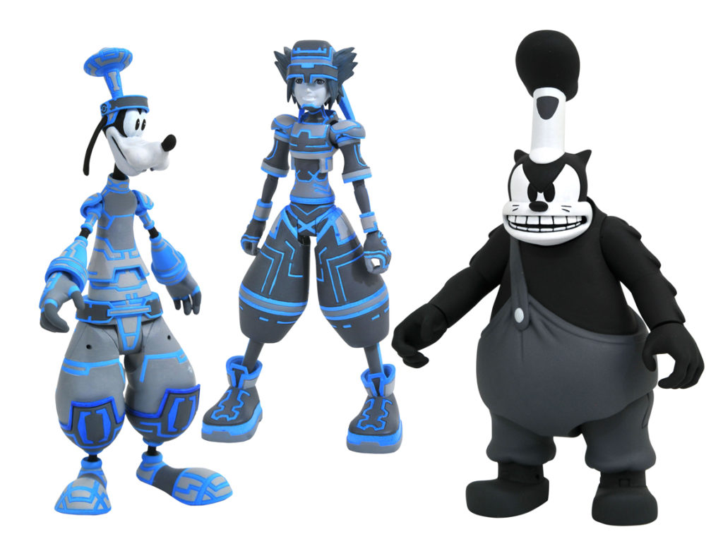 In comic shops and specialty stores now, the second series of Kingdom Hearts Select action figures features the world of Space Paranoids, pairing Sora with Sark, Goofy with Tron, and Organization 13 Mickey with an Assassin Heartless! Look for Sora, Goofy and an exclusive Timeless Pete at Walgreens, and Sora, Tron with an exclusive Soldier Heartless, and an exclusive unhooded Mickey with Assassin at GameStop.