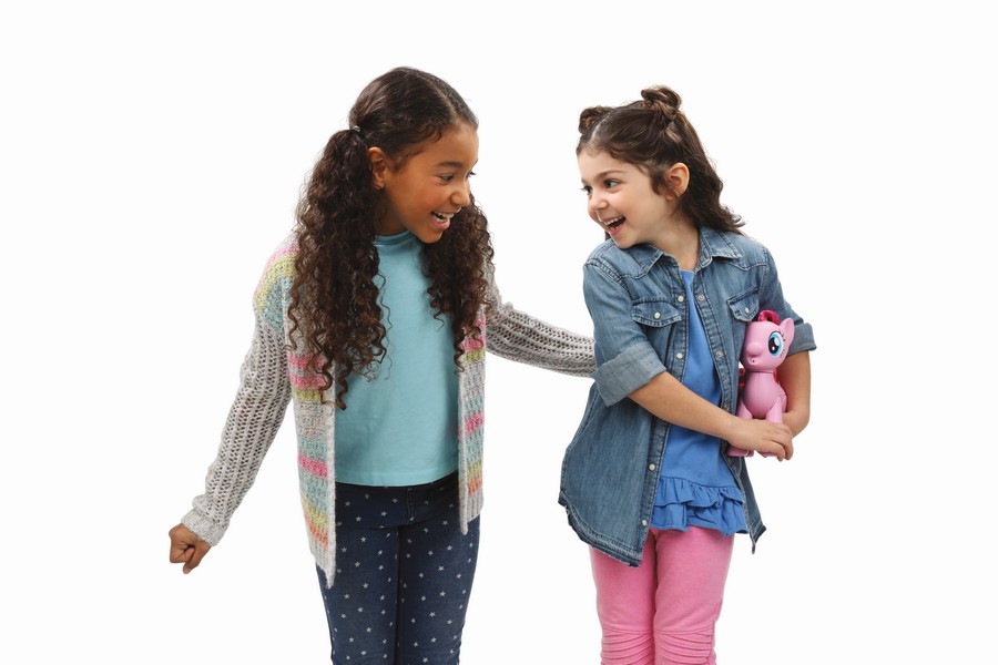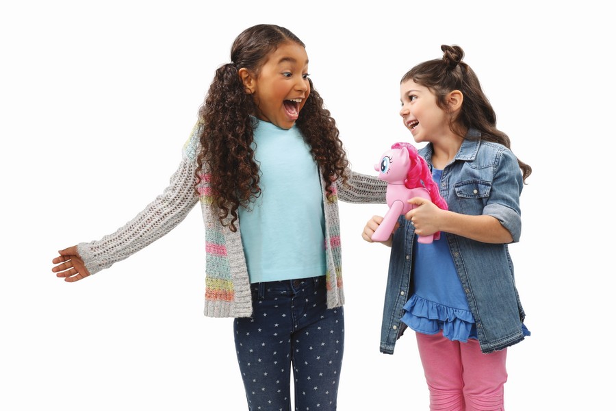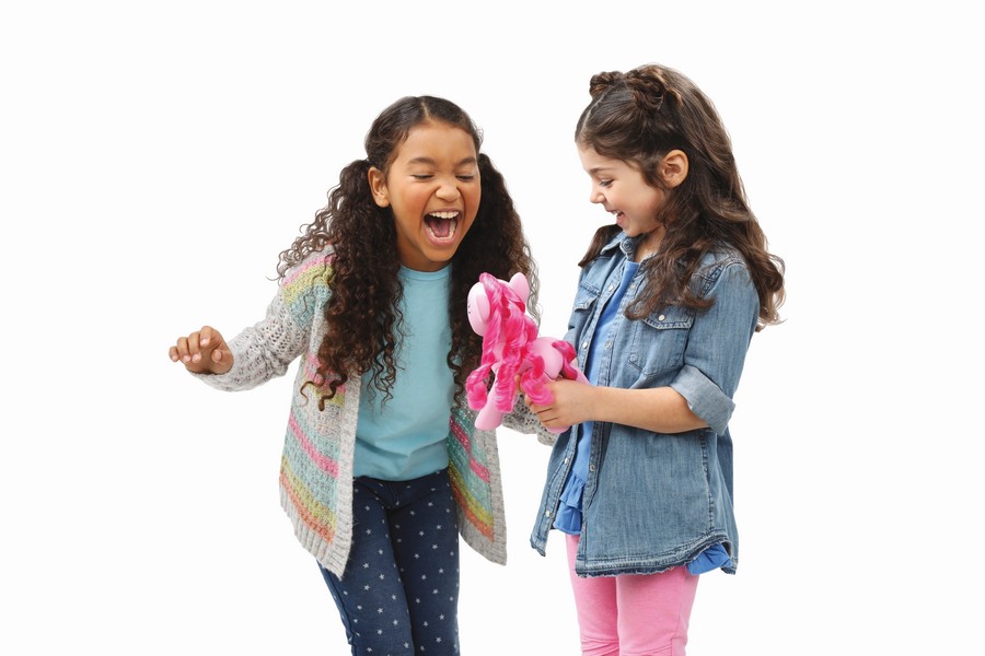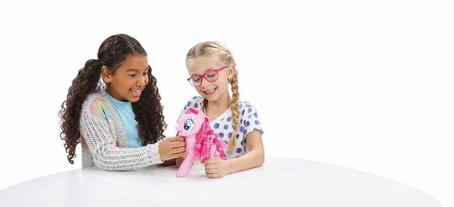 If there’s one thing Pinkie Pie loves more than planning parties, it’s laughing! Hear Pinkie Pie laugh with this ticklish figure that’s fun and silly like her character in entertainment. When kids tickle Oh My Giggles Pinkie Pie toy, she starts to giggle, wiggle, and laugh! Tickle her chest to hear Pinkie Pie giggle — the more she is tickled, the harder she laughs and faster she moves! Sounds and movement can also be activated by light sensor in figure’s mouth, creating unexpected moments of surprise and delight when activated by motion. Fans of the My Little Pony: Friendship is Magic TV show can have fun laughing alongside this interactive toy that moves and makes laughing noises. Figure has long rooted hair and signature character cutie mark of 3 balloons. Available at most major toy retailers nationwide and on HasbroToyShop.com.