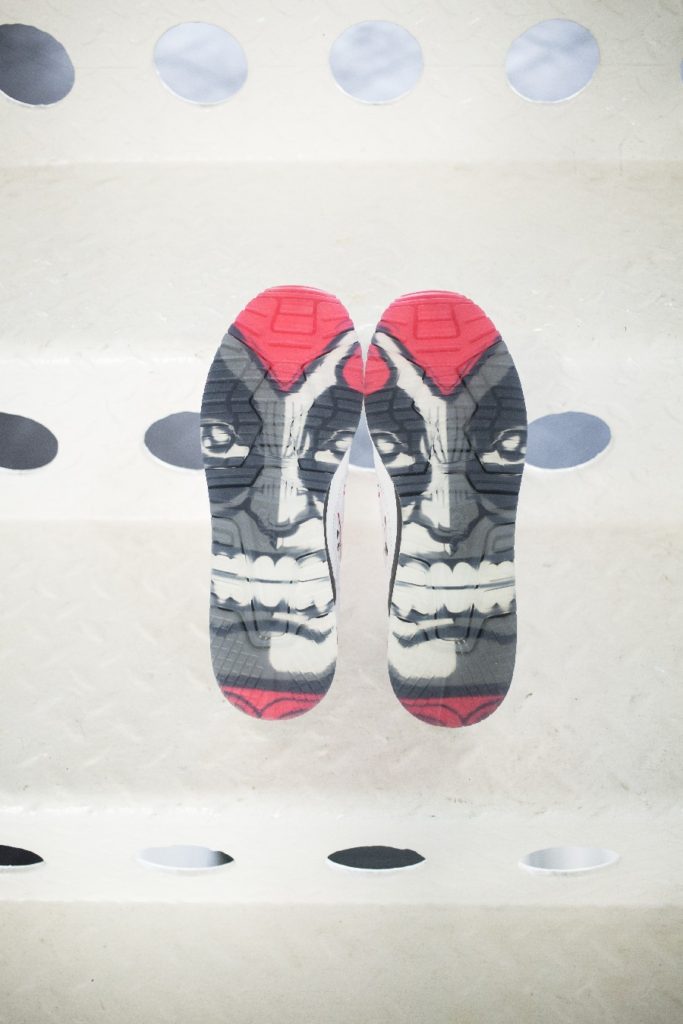 The black Snake Eyes model features a crystal rubber outsole with a discovery element, premium emblem and reflective detailing with black leather; the model is elevated and modernized with custom art on the insert. The white Storm Shadow model features a crystal rubber outsole which masks the character beneath while the premium emblem detailing grounds the model in the story. Through the intertwining of story and design aesthetic the model is elevated and modernized with custom art on the insert. On the bottom of both shoe models is an iced outsole revealing Zartan – a shadowy figure who plays a key part in the Snake Eyes and Storm Shadow story.