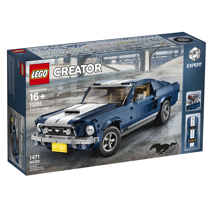 Discover the magic of an iconic 1960s American muscle car with the LEGO® Creator Ford Mustang, featuring dark-blue bodywork with white racing stripes, bonnet scoop, printed mustang grille badge, GT emblems and 5-spoke rims with road-gripping tires. Developed with input from Ford, this authentic replica comes with optional add-ons for customization, including a selection of license plates, supercharger, rear ducktail spoiler, beefy exhaust pipes, front chin spoiler and a nitrous oxide tank. You can even adjust the lift of the rear axle for an extra-mean look! Remove the roof panel or open the doors and you have access to the detailed interior with handsome seats, radio, working steering and a midconsole gearshift. Store items in the trunk or lift the hood to reveal a detailed big block 390 V8 engine with battery, hoses and air filter detailing. This advanced building set has been designed to provide a challenging and rewarding building experience full of nostalgia and makes a great centerpiece for the home or office.