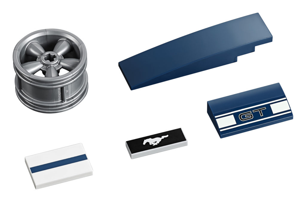 - New-for-March-2019 special elements include 5-spoke rims, 2×8 brick with bow, 1×3 mustang logo tile, 2×4 bow with ‘GT’ Emblem.