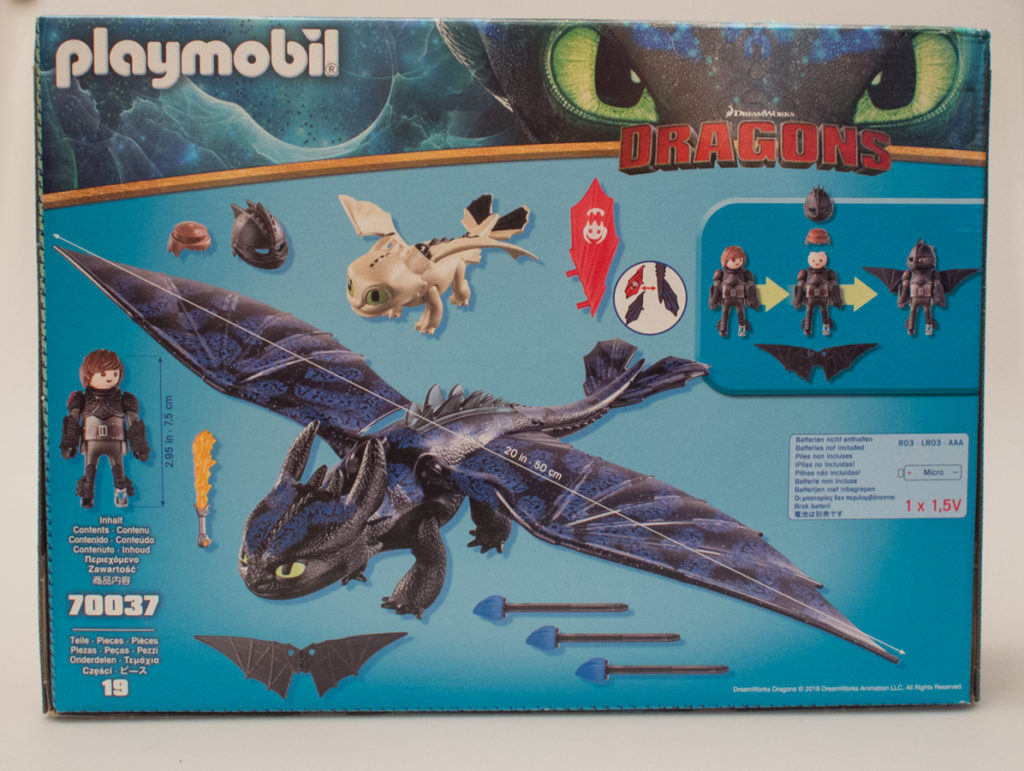 The box is bold and bright with the vast majority of the package’s front being covered by product photography – which is nice to see the toys so prominently featured on the box. The top of the front does feature some Dragons artwork and a multi-lingual blurb calls out the LED light-up feature. The back of the box specifically details the 19 piece contents of the box with Hiccup (and accessories), Toothless (missles and red tail fin accessories) and the baby dragon all shown. One AAA battery is needed for the LED lights, which is not included.