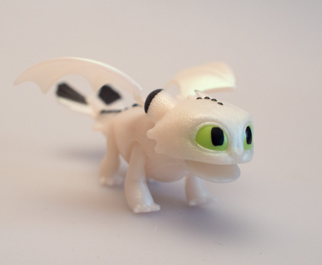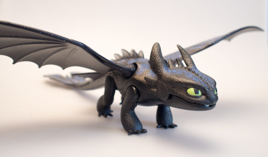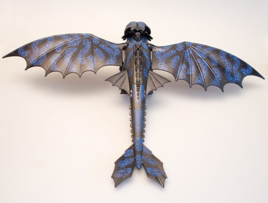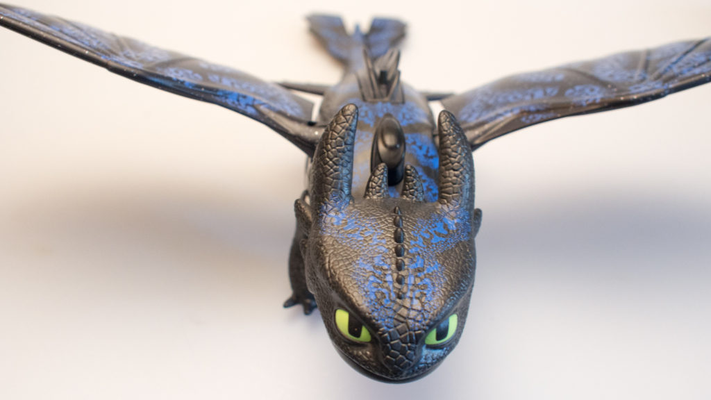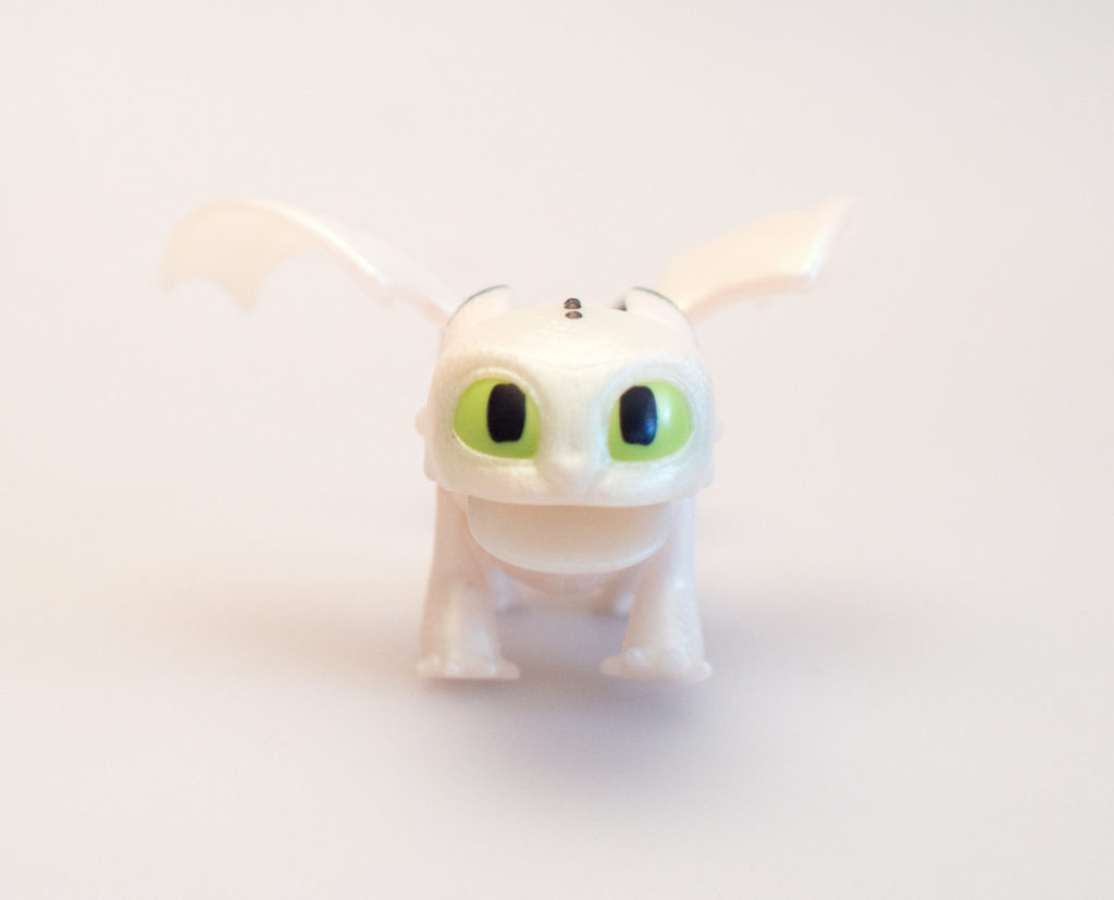 The baby dragon is made with a really cool iridescent plastic and the black and green paint really look great and are cleanly applied. The baby dragon has wings that pivot around the attachment point, an opening mouth and poseable legs. The baby may do less than Toothless, but might be even cuter. The baby is adorable.