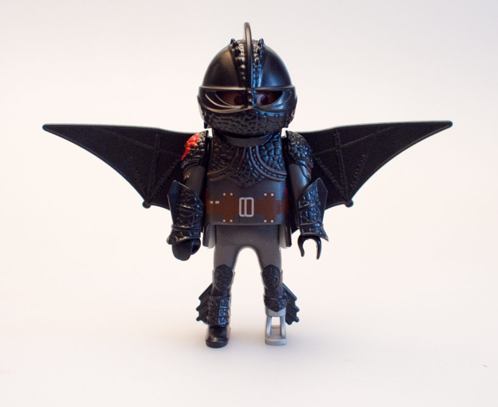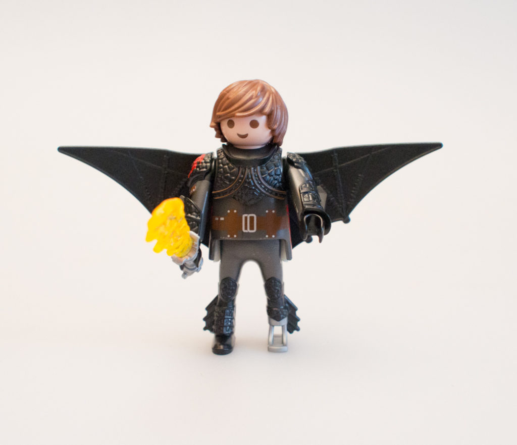 The Hiccup minifigure takes the Playmobil format and gives it just a little twist to make it fit the ‘Dragons’ universe. Hiccup, in addition to more traditional Playmobil hair – also has a windswept hair piece. He includes a helmet, a firey sword and snap on guantlets. He is articulated at his neck, shoulders and waist.