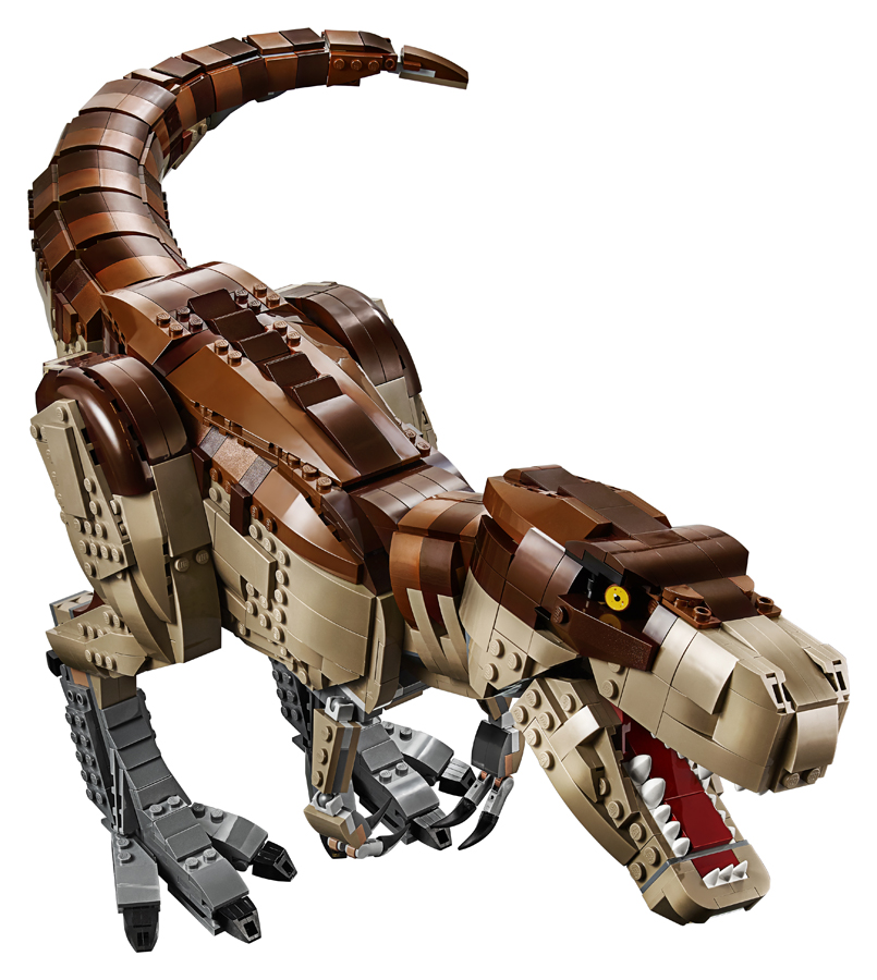 - Brick-built LEGO® T. rex dinosaur toy features snapping jaws, posable head, arms, legs and tail