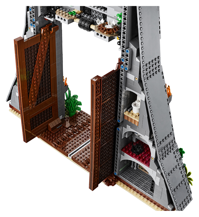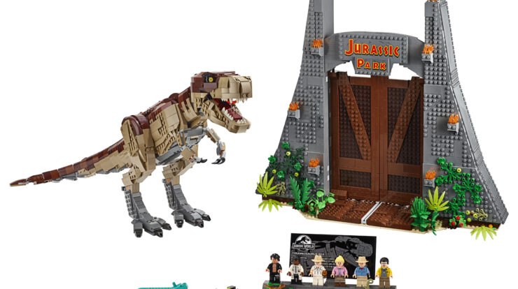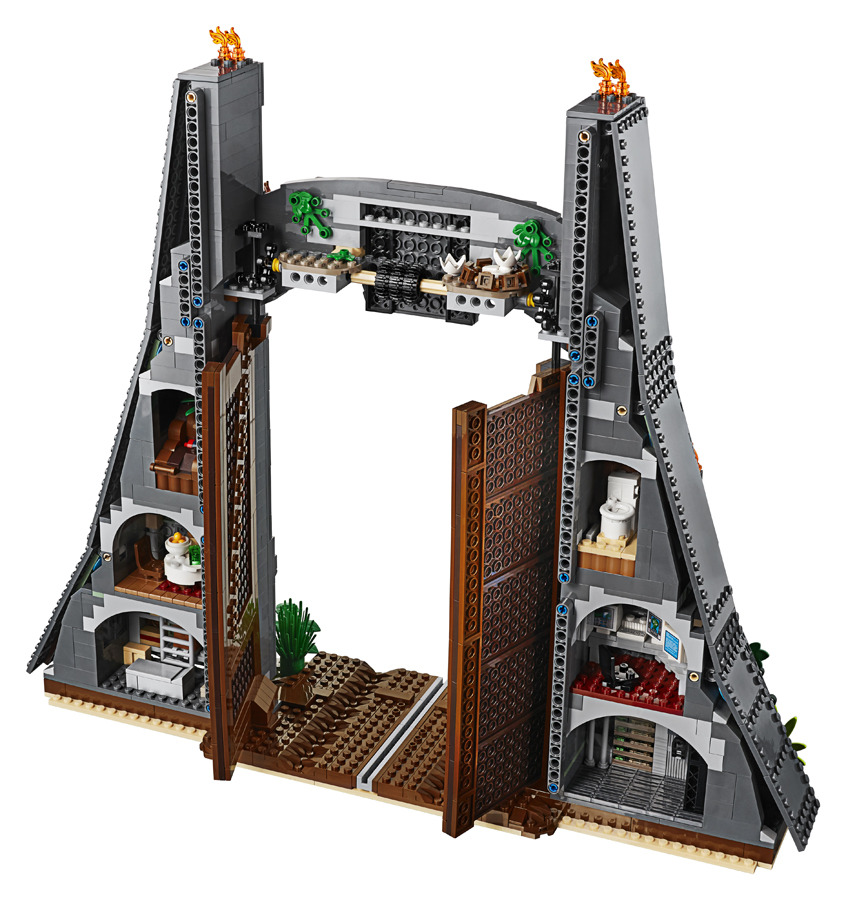 - The brick-built LEGO® version of the original Jurassic Park’s iconic gate has an opening function, jungle leaves and flame elements.