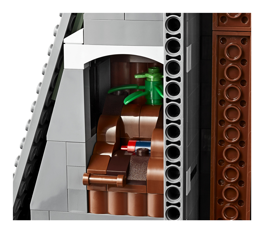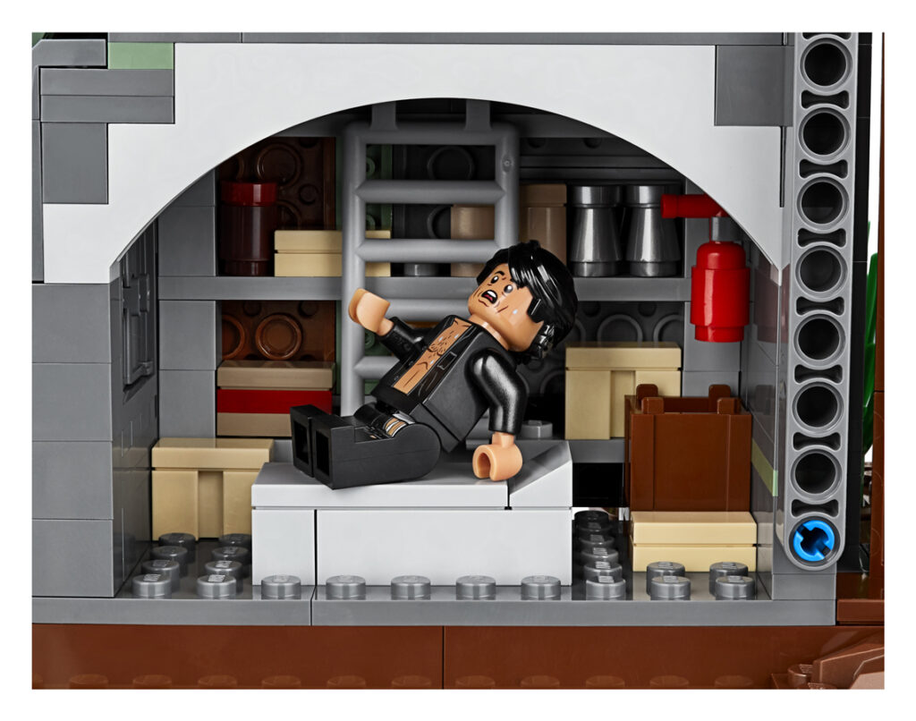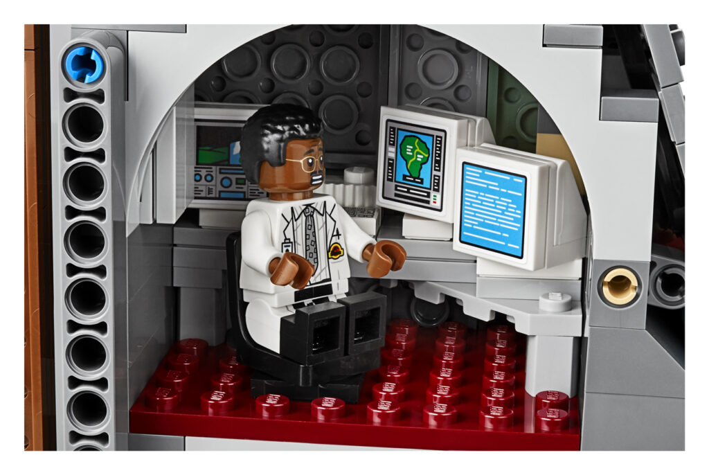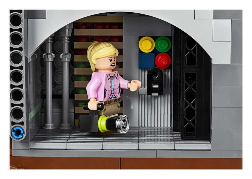 - The wall framing the gate features a buildable dinosaur nest with 2 cracked egg elements at the top and other brick-built scenes inspired by the movie, including: a bunker with a buildable bed for Ian Malcolm, flashlight and fire extinguisher, plus ladder and display case elements; power shed for scene with Ellie Sattler; John Hammond’s dining room with table and minifigure chair, plus ice cream, spoon and 3 cookie elements; Ray Arnold’s control room with a buildable desk, 3 computers and a minifigure chair; scene with a buildable bathroom; scene for Dennis Nedry with a buildable mud slide and shaving cream can.
