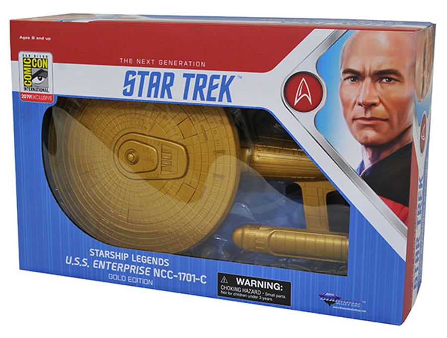 The Enterprise C has left space dock, and her first stop is SDCC! Painted gold as it is often seen on the walls of the Enterprise, this model of the Enterprise C measures approximately 16 inches long, the first time the iconic ship has been done in this scale. Packaged in a full-color window box, it includes a display stand. Limited to only 250 pieces. $60.00