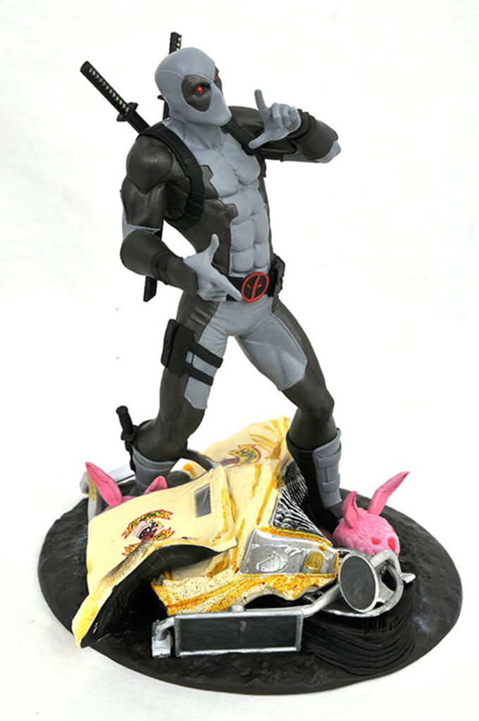 Deadpool returns to SDCC in style! Unfortunately, his ride got trashed along the way, and Deadpool is posed atop a destroyed taco truck base, sporting bunny slippers and wielding twin finger guns with the safeties off! This exclusive X-Force Edition of Deadpool stands approximately 10 inches tall and is made of high-quality PVC with collectible-quality paint applications. Packaged in a full-color window box. Designed by Caesar, sculpted by Cortes Studios! Limited to 10,000 pieces. $50