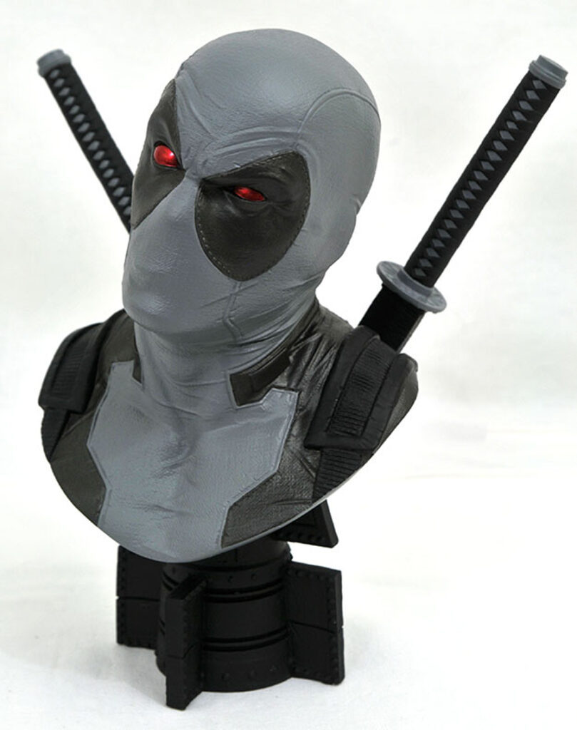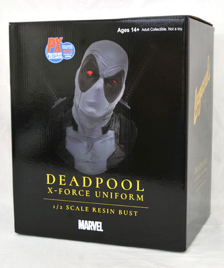 X-Force Assemble! This exclusive ½ scale bust of the Merc with a Mouth in his X-Force colors measures approximately 10 inches tall with exacting sculpted details and the highest level of paint applications. Limited to only 1,000 pieces, this hand-numbered resin bust comes with a numbered certificate of authenticity in a full-color, hand-numbered box. Designed by Joe Allard, sculpted by Rocco Tartamella! $150