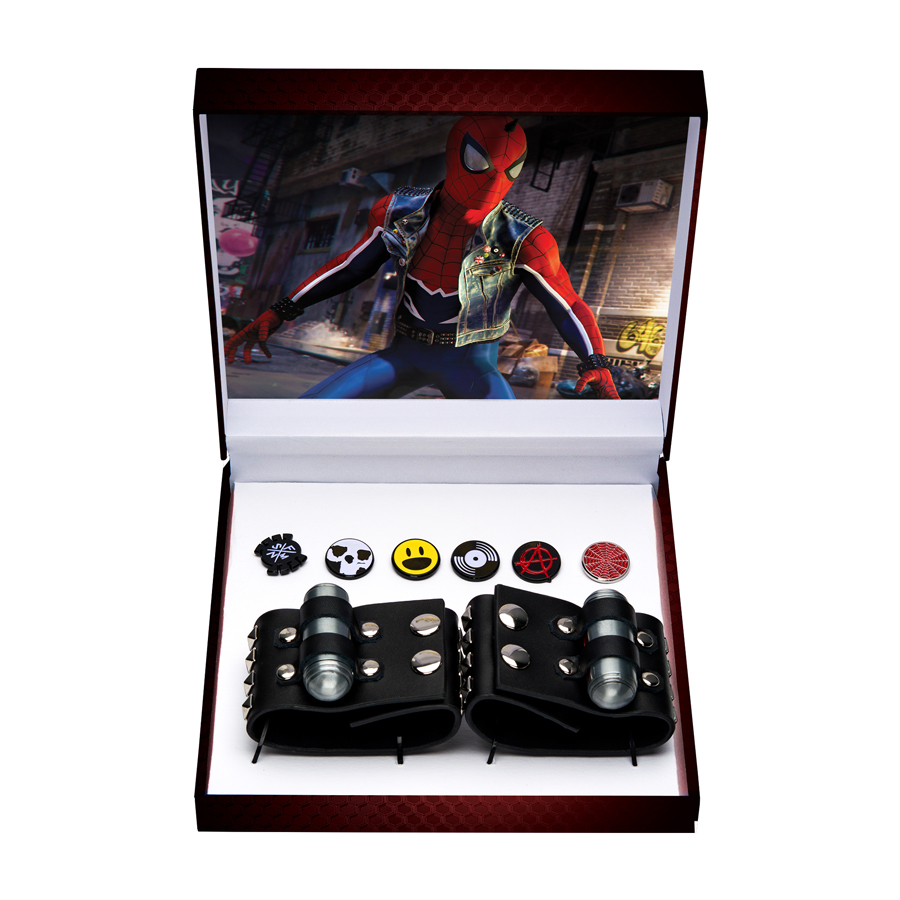 Description: Exclusive. Limited to 1000. Officially licensed 2019 San Diego Comic Con Exclusive Marvel Spider-Punk Bracelet Set. Set includes 2 faux leather bracelets with replica webshooters each measuring approximately 2″ wide by 7.5″ to 8″ long, adjustable with button snaps. Also 6 replica enamel pins worn by Spider-Man. Set comes in a collectors box with a certificate of authenticity.