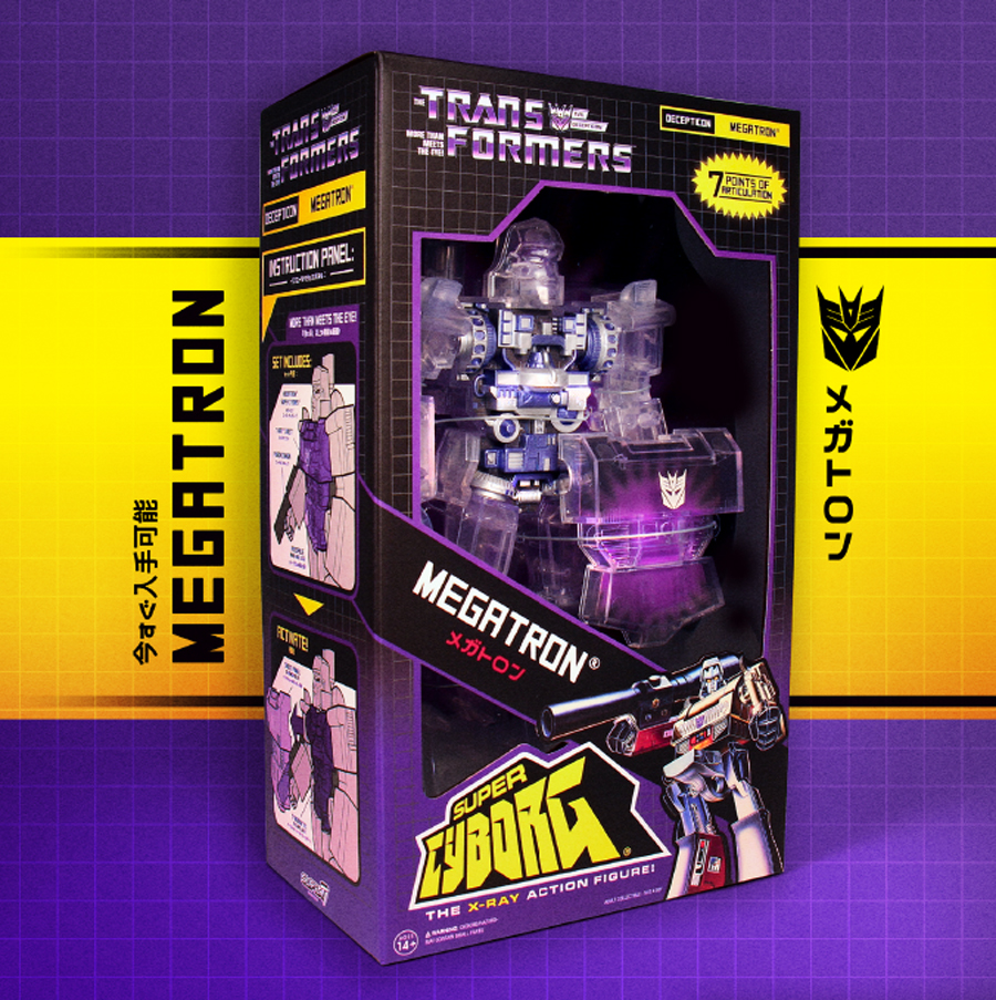 The Transformers Super Cyborg Megatron launches his villainous campaign of peace through tyranny at SDCC 2019! The evil leader of the Decepticons is a Generation One Cartoon-Accurate 12″ poseable action figure with fusion cannon and removable chest plate, showcasing his robotic innards. The debut X-Ray edition Super Cyborg Megatron is cast in crystal clear plastic with painted inner torso, and packaged in a deluxe window box. SDCC Exclusive. $75 each.