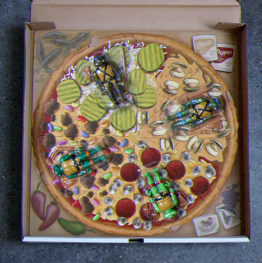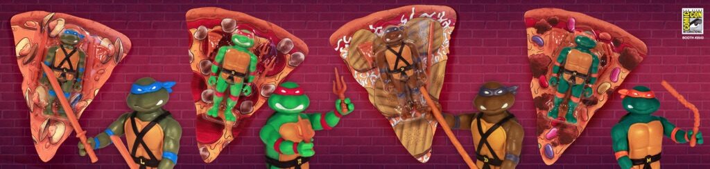 Cowabunga! The Teenage Mutant Ninja Turtles ReAction Figures are here! Fresh from the oven for their debut at San Diego Comic-Con, the steaming-hot halfshell heroes are stealthily stashed with their favorite food – Pizza! The fabulous four TMNT ReAction Figures are reimagined as authentically detailed 3 ¾” action figures, blister-packaged with accessories on pizza-slice shaped cardbacks featuring some of the Turtles’ favorite pizza toppings, inside a genuine pizza delivery box. Each four-pack set includes: