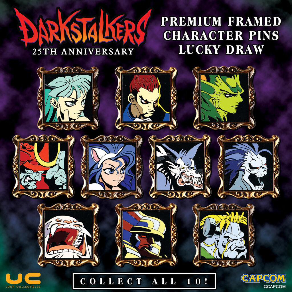 It is the 25th anniversary of Darkstalkers! And UDON Collectibles proudly presents our Premium Framed Character Pin Lucky Draw! Our very first set of Darkstalkers pins featuring the original 10 playable characters from the first game from 1994! Featuring brand new artwork by UDON Artist Long Vo, each pin is double layered with a jewel-like cloisonne pin inset in a 3D sculpted antique bronze finished frame. Pins are sold in sealed blind bags in the form of a lucky draw, where fans will dig into a raffle box and actually draw out the pins themselves!! How exciting is that! The full set of 10 pins include Morrigan, Demetri, Rikuo, Bishamon, Felicia, Talbain, Lord Raptor, Sasquatch, Anakaris, and Victor. Can you achieve a perfect KO and collect all 10? $15 per draw.