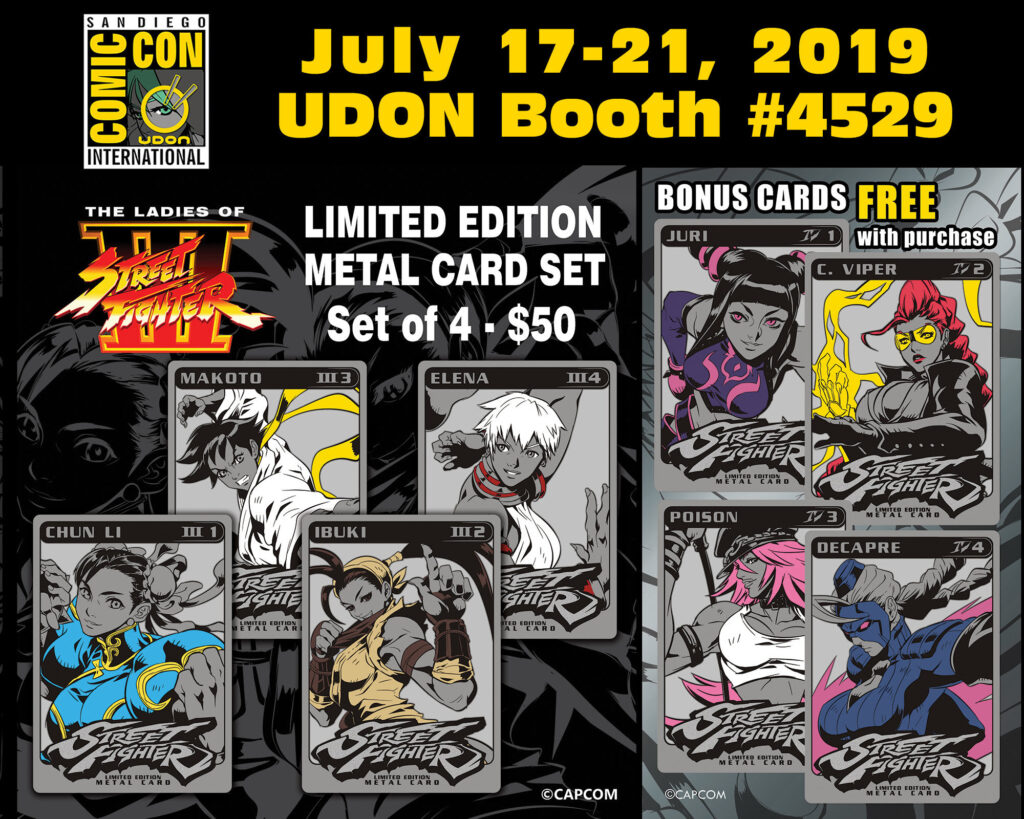 The Street Fighter Limited Edition Metal Cards are back by popular demand! Precisely crafted with special laser etching, printing, and die-cut technology, these metal trading cards feature brand-new artwork by ULTRA STREET FIGHTER II artist Long Vo. Just like in previous years, these highly collectible cards will be given away RANDOMLY to fans who make qualified purchases at the UDON Booth! 4 new silver cards include fan favorite characters C.Viper, Jury, Poison, and Decapre! Beat this bonus stage with a perfect score and collect the complete set! FREE giveaway with qualified purchases.