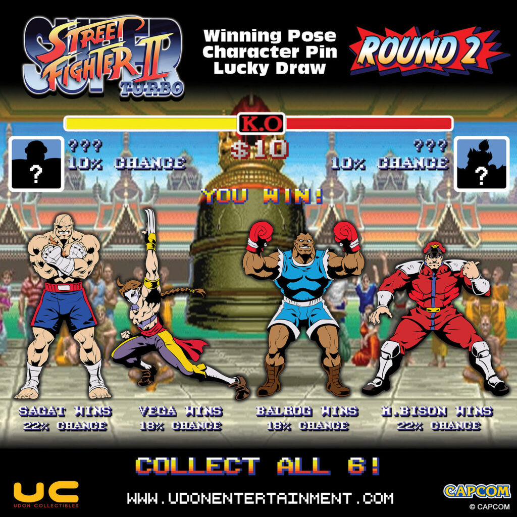 Are you ready for ROUND 2!? Fresh off of their Anime Expo debut, new challengers approach with our convention exclusive Super Street Fighter II Turbo Character Winning Pose Pins! These pins are sold in blind bags, picked at random out of a raffle box. Round 2 consists the final bosses of STREET FIGHTER II, AKA the FOUR KINGS – Sagat, Vega, Balrog, and M. Bison! To make this round super special, there is also a hidden extra-rare variant, AND a hidden character to find! Win this round with a perfect KO – if you can collect all 6 pins! Super Street Fighter II Turbo Character Winning Pose Pins Round 2 will be $10 each, random draw. Pick up these bad boys from UDON Booth #4529!