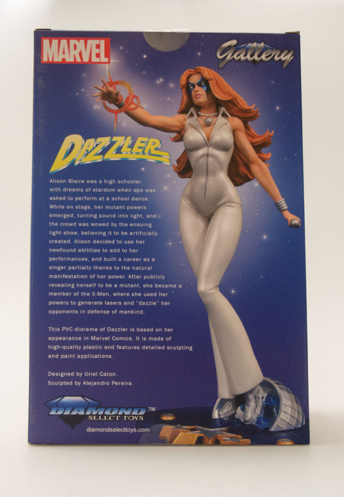 The packaging for the Mavel Gallery PVC statues features a four sided window box which allows plenty of light and the opportunity to enjoy the statue in the packaging. This is great for collectors who lean towards keeping things in the box, especially since most statue packaging are fully closed boxes, relying only on artwork or photography to show the statue in the box. Here you can see Dazzler relatively unobscured. The back of the box features a photo of the statue along with her bio describing the manifestion of her mutant powers and her eventual joining the X-Men. The back of the package also gives credit to the artists behind this statue, with Dazzler designed by Uriel Caton and sculpted by Alejandro Pereira. It’s always a nice touch to see the artists credited for their work.