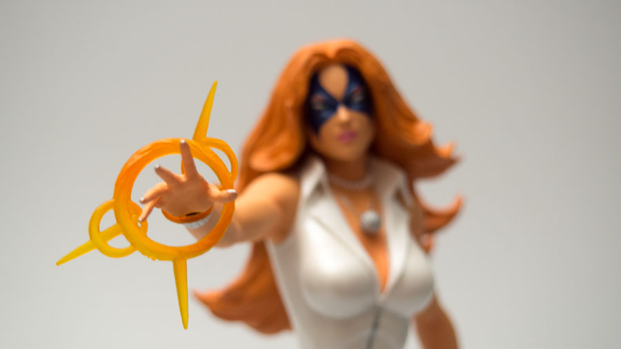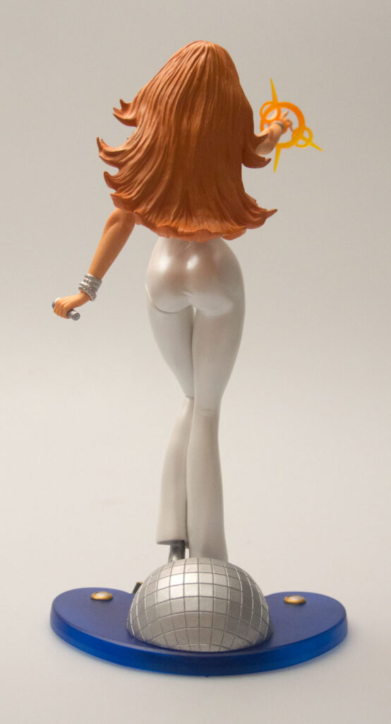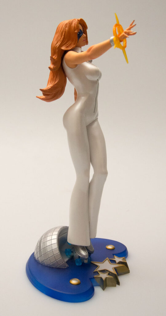Out of the packaging, Dazzler stands right near 9 inches tall. She’s wearing her white jumpsuit, has her discoball necklace, feathered hair, roller skates and microphone in hand – she’s everything you want a Disco Dazzler to be. The display stand even has her standing directly in front of a disco ball. The sculpt is pretty much perfect. I’m impressed by the way the sculpt captures the essence of movement, the one arm forward and up with the microphone arm back and behind, the bent knee with the tip of the roller skate down and the wind swept hair all keeps this statue looking very dynamic. On her raised arm, she has a ‘dazzling power’ effect. The paint and detailing on the statue are perfect, even fine details – the jumpsuit zipper down the front of her costume – are painted perfectly. The paint choice for the jumpsuit is particularly successful, as they’ve avoided a plain white, opting for a paint with an almost opalescent appearence, giving it a nice shine and making it far more interesting than a flat white.
