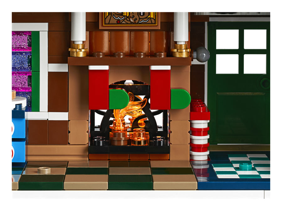 - The Gingerbread House features frosted roofs with colorful candy buttons, a rich facade with candy cane columns and walking sticks, glittery windows and a tall chimney stack with a glowing fireplace, plus a detailed interior, brick-built baby carriage and a snow blower.