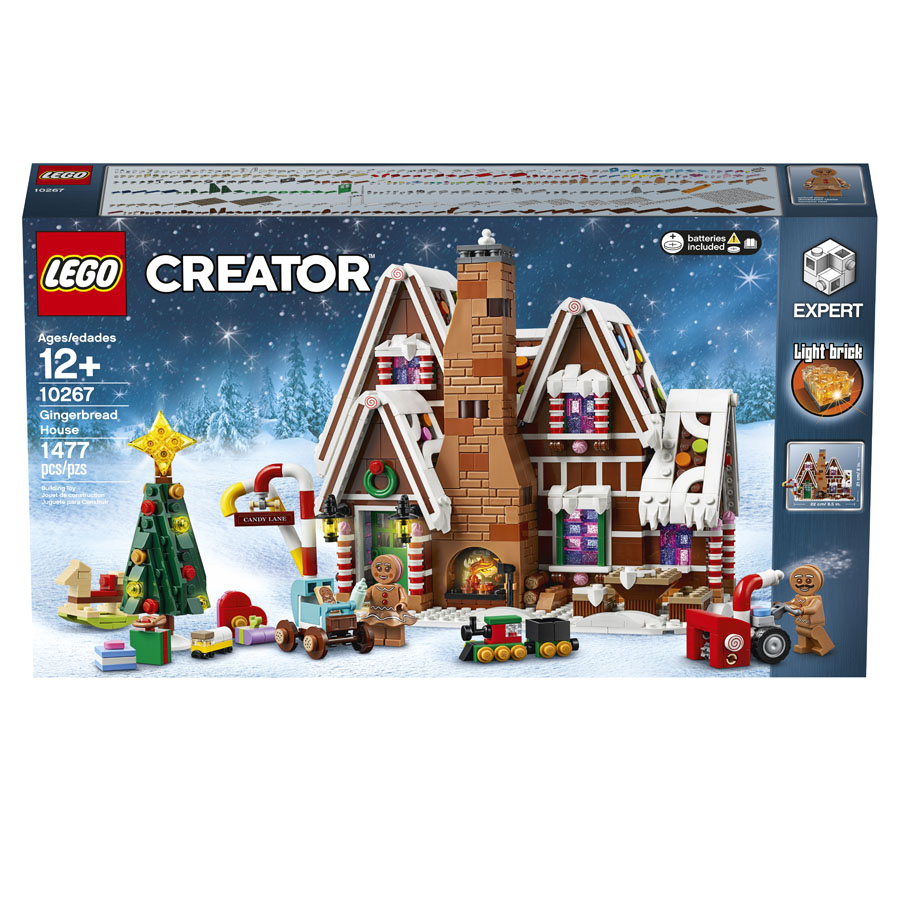 Enjoy a festive build and play experience with the LEGO® Creator Expert 10267 Gingerbread House. A treasure chest of magical details, this amazing model features frosted roofs with colorful candy buttons and a delicious facade with candy-cane columns, glittery windows and a tall chimney stack with a glowing fireplace. Inside the house there’s an array of fun details and candy furnishings including a tasteful bedroom with chocolate bed and cotton candy lamp, and a bathroom with the essential toilet and bathtub. This wonderful LEGO Gingerbread House sets the scene for imaginative adventures with the gingerbread family. Children can light up the cozy fireplace, help clear the sidewalk with the snow blower and nestle the gingerbread baby in its carriage. It also includes a decorated Christmas tree with wrapped gifts and toys, including a rocking horse and a toy train. This advanced LEGO set delivers a challenging and rewarding building experience and makes a great seasonal centerpiece for the home or office. Includes gingerbread man, woman and baby figures.