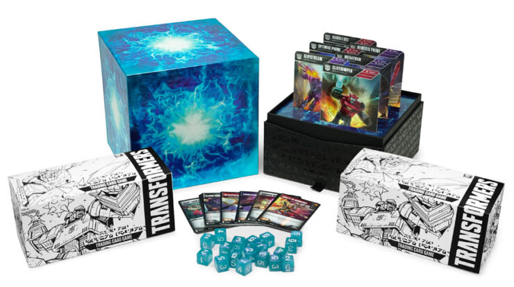 The Character Cards, Battle Cards, and damage counters are all housed in a beautiful, foil Energon Cube box, the lid of which also allows for a display configuration for the character cards.