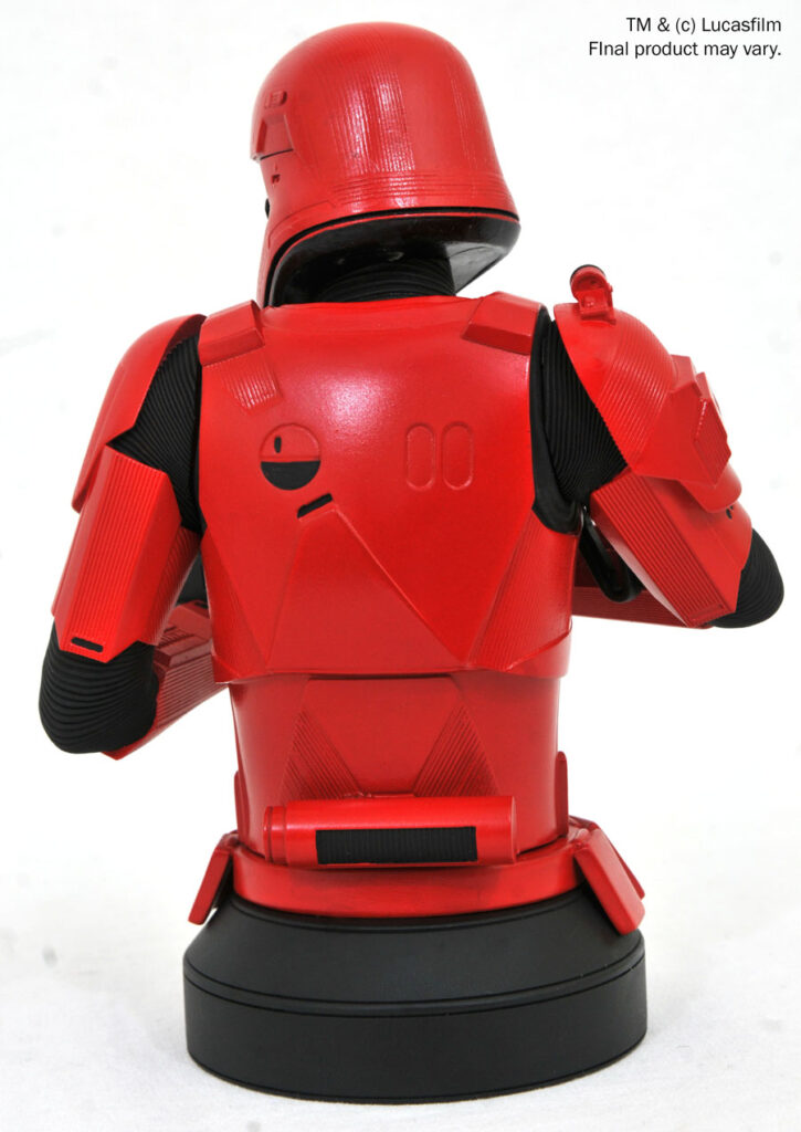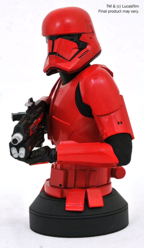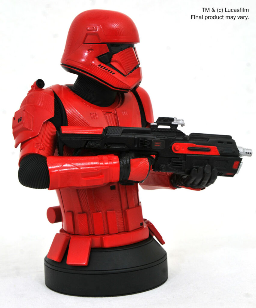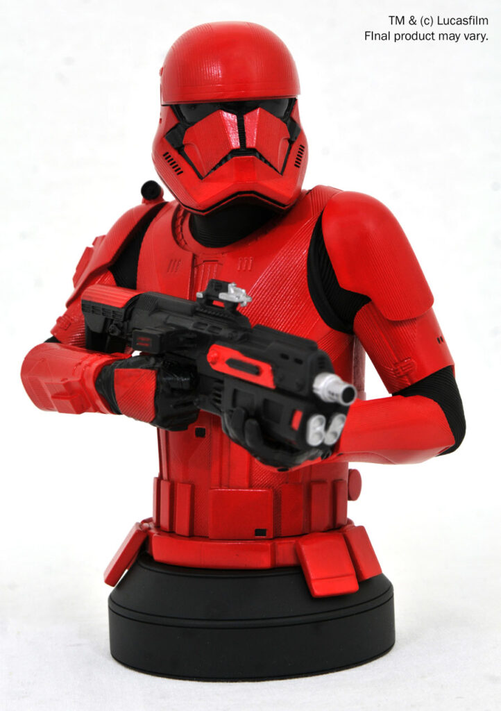 A Gentle Giant Ltd. release! Star Wars: The Rise of Skywalker has come! The new Star Wars movie introduced the world to Sith Troopers, with their distinctive red armor, and this new mini-bust depicts one wielding a matching blaster rifle. Measuring approximately 6 inches tall, this 1/6 scale bust features detailed sculpting and paint applications and comes packaged in a full-color box with a numbered certificate of authenticity. It is limited to 1,000 pieces. NOTE: This item is currently only accessible for pre-order by Premier Guild members; any remaining inventory will go on sale to standard customers on January 31.