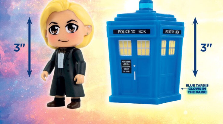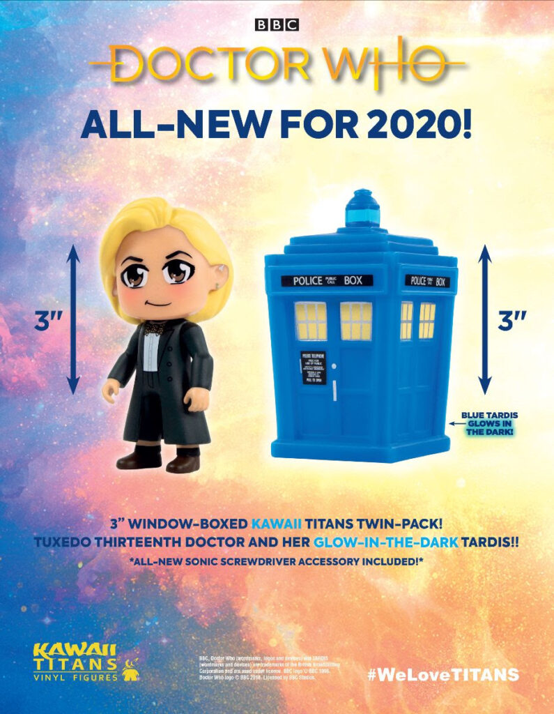 Today Titan Merchandise announced an all-new 3″ Titan Vinyl 2-pack featuring the Thirteenth Doctor Kawaii TITAN, dressed in the tuxedo she wore in Spyfall (episode one of season twelve) with an updated Blue Glow-in-the-dark TARDIS. This 3″ Twin Pack comes in window-boxed packaging and the Thirteenth Doctor will be accompanied by her sonic screwdriver accessory!