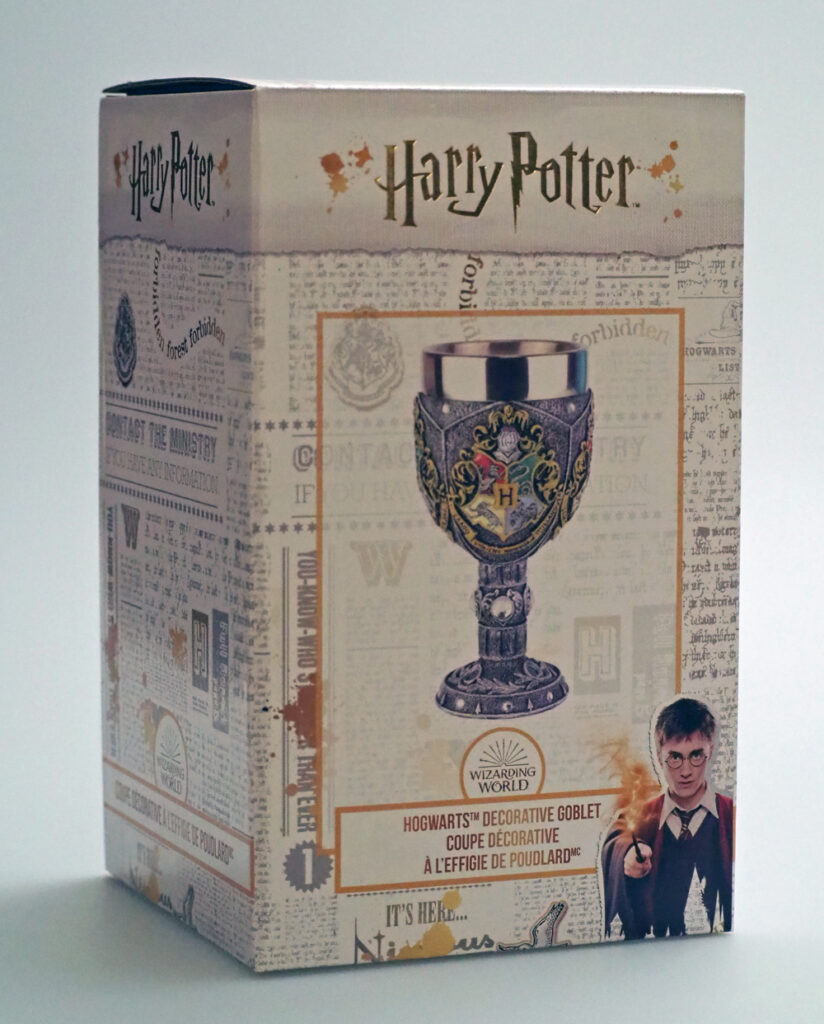 The packaging for the goblet is just dripping in Harry Potter, with the logo predominantely featured on all sides of the packaging with a Harry Potter themed newsprint covering most of the box. The front and the back of the package features product photography of the goblet and the front includes the wonderful wizard himself, Harry Potter. Overall the package presents the product very well and is steeped in theming.