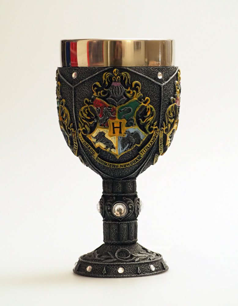 Out of the box, the goblet stands a little over 7 inches tall and has a 3½ inch diameter. The goblet holds 12 oz of liquid in it’s brushed metal cup. The body of the goblet has the look of stone with the Hogwarts crest repeated four times around the goblet. The goblet is adorned with several small gem decorations which do a good job of breaking up the dark ‘stone’ color and suggest a jeweled chalice. The goblet itself is deceptively light, weighing less than a pound when empty. It looks like it should weigh significantly more. Of course, this is a good thing as it really helps make this goblet something even the youngest of Harry Potter fans can use – with correct supervision, of course. It is important to note that some care is needed when cleaning the goblet. It is not dishwasher safe, requiring a brief hand washing without soaking the Goblet.