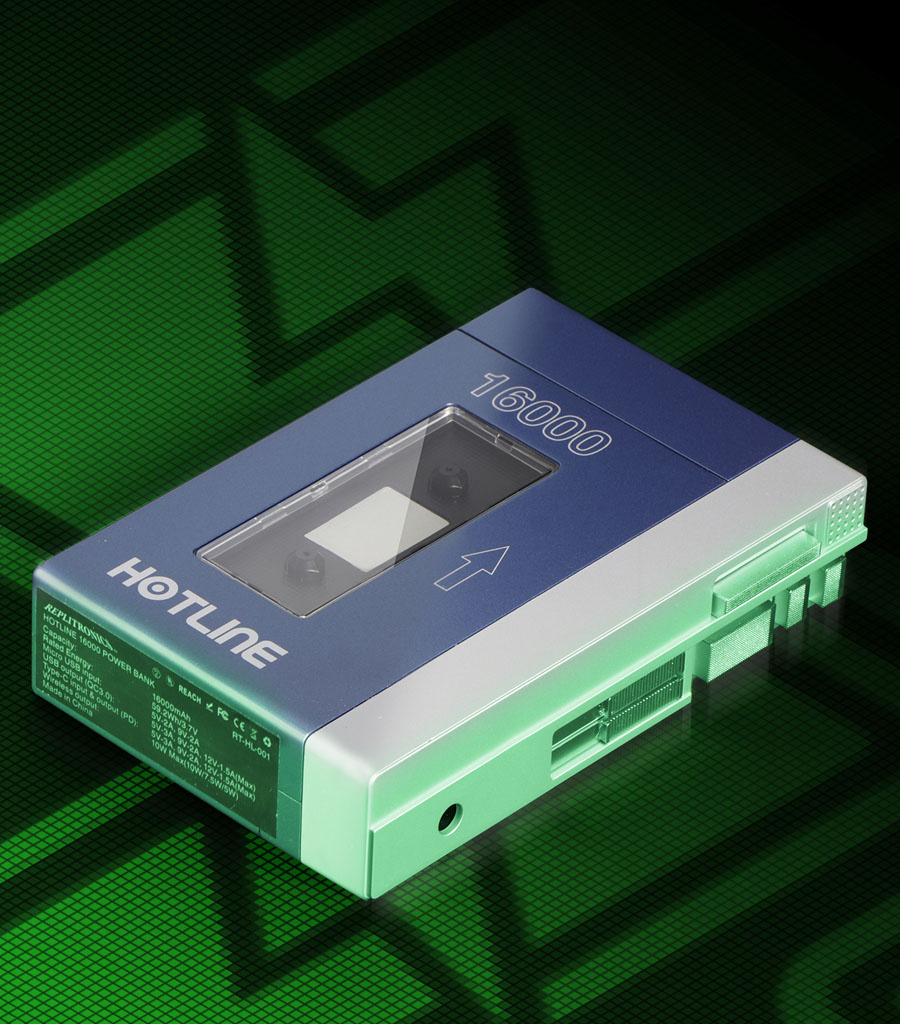 The RepliTronics Hotline 16000 mAh Power Bank is a multi-functional, portable power bank built into a replica 1:1-scale vintage personal cassette player. It has the ability to charge three items at once via: USB 3.0, USC-C and it supports 10W fast wireless charging for Qi-enabled devices.