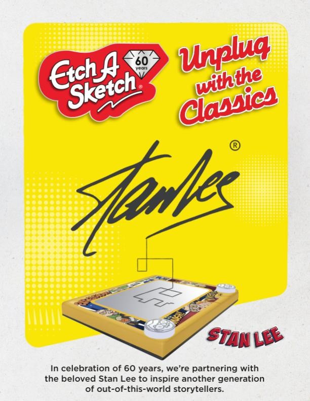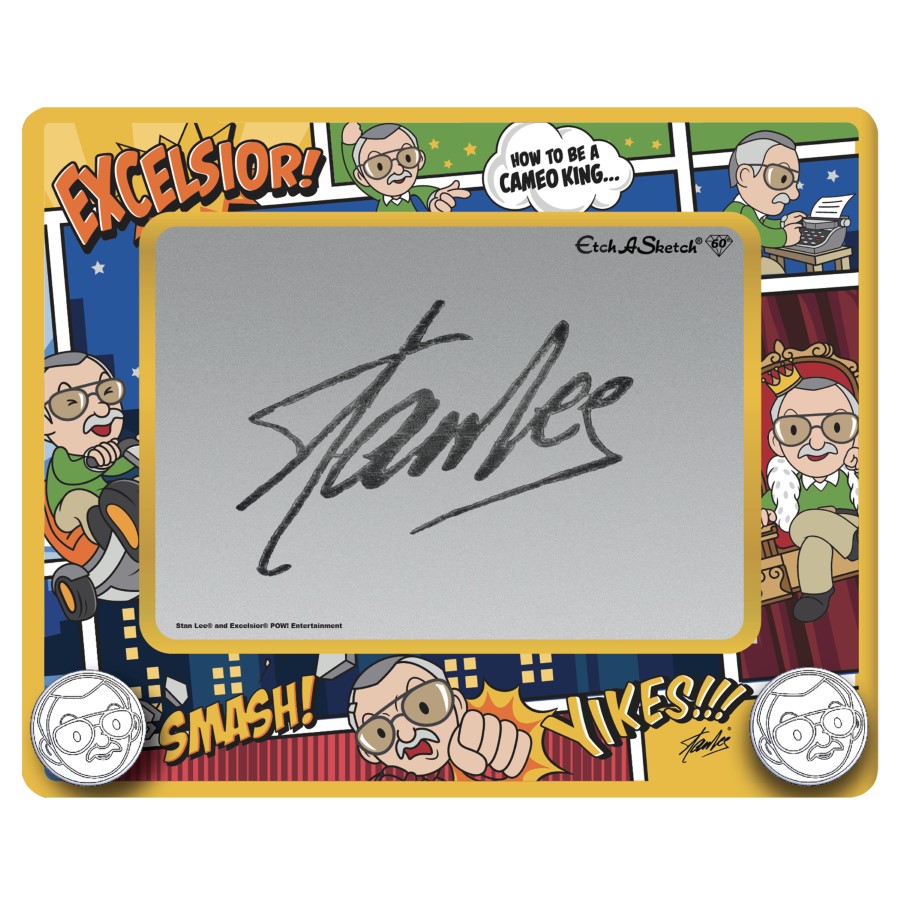The limited-edition Stan Lee-inspired Etch A Sketch not only helps celebrate the 60th anniversary of the original magic screen, but also brings the legendary comic book author to life in a whole new way for his fans! With a colorful comic frame and Stan Lee knobs to draw with, this item will be available in limited quantities at EtchASketch.com for $19.99 starting on May 12th, and will then be available at retail later this year for a limited time.