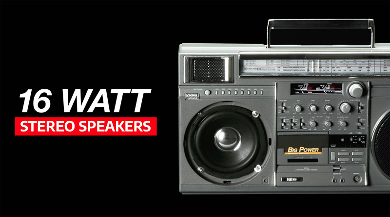 - Dual 2.5″ stereo speakers delivering 16-watts of crisp, undistorted sound