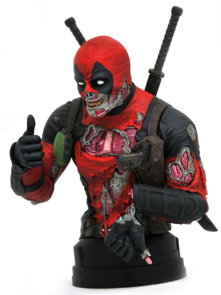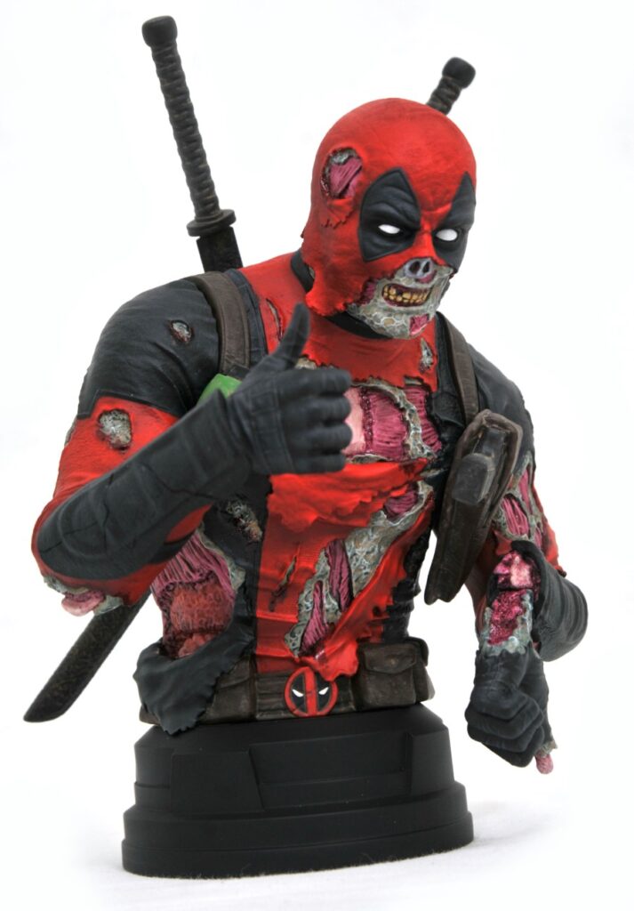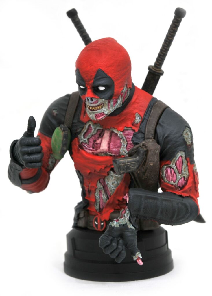 Putting the “dead” in “Deadpool,” this 1/6 scale resin bust of the Merc with a Mouth shows him fully zombified, with mottled skin and exposed muscle. He’s giving two thumbs up, but one thumbs-up hand is about to fall right off his wrist! Limited to only 1,000 pieces, it comes packaged in a full-color box with a numbered certificate of authenticity. A Gentle Giant Ltd. release!