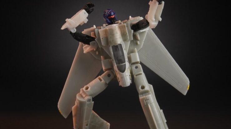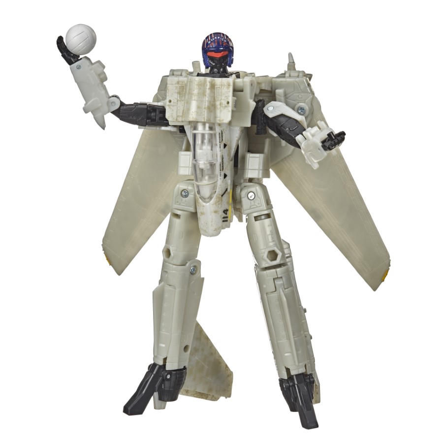 TRANSFORMERS Autobot MAVERICK stands at 7 inches in robot mode and can convert from robot to classic Northrop Grumman F-14 Tomcat® jet mode in 25 steps (The F-14 Tomcat is a registered trademark of Northrop Grumman, and is used under license). He includes a screen-inspired miniature motorcycle accessory and 2 alternate hands that can hold the included volleyball accessory. This bot is always ready to go vertical in jet mode or dominate a slow-mo volleyball montage in robot mode. This MAVERICK robot figure also features folding jet wings, movie-inspired details, including a helmet design inspired by the 2020 Top Gun: Maverick film, and includes 4 missile accessories that can be mounted on figure’s arms in robot mode and under wings in jet mode. Even the packaging is inspired by the aircraft carrier!