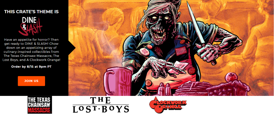 The next time you’re invited over for dinner, make sure you’re not the main course by prepping yourself with Loot Crate’s new Dine and Slash Loot Fright Crate. No reservations are needed when you slice open this crate of collectibles from some of your favorite horror and cult classics.