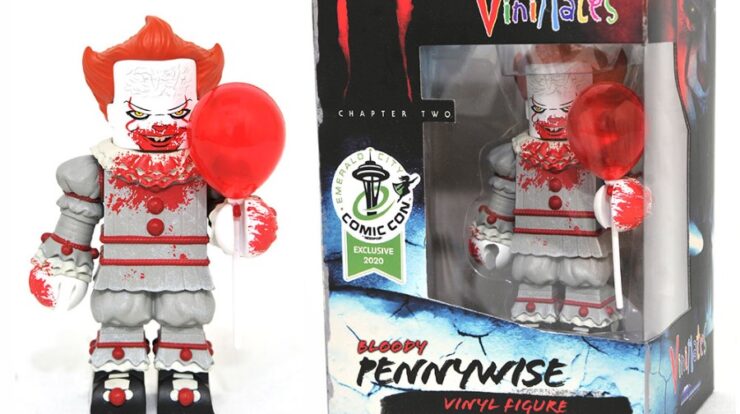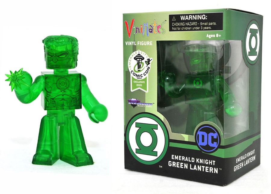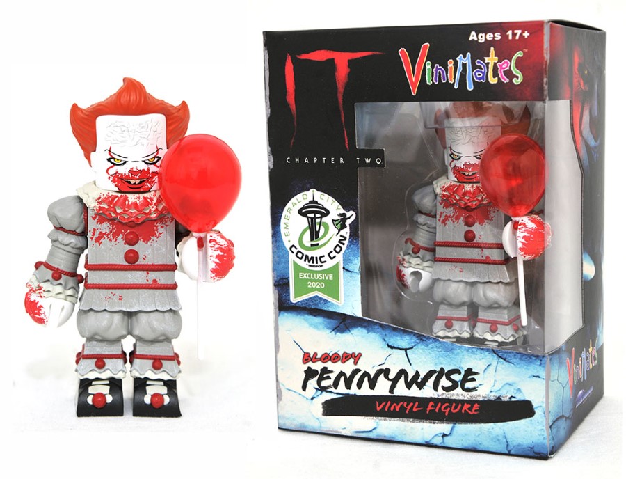 The first exclusive, limited to only 250 pieces, is the DC Comic Vinimates Emerald Knight Green Lantern Vinyl Figure! Cast in translucent material, this 4-inch figure captures Hal Jordan in block-figure form and retails for only $9.99. The second exclusive, also limited to 250 pieces, is the IT Vinimates Bloody Pennywise Vinyl Figure! This 4-inch figure with a show-only paint scheme features a poseable head and also retails for $9.99.