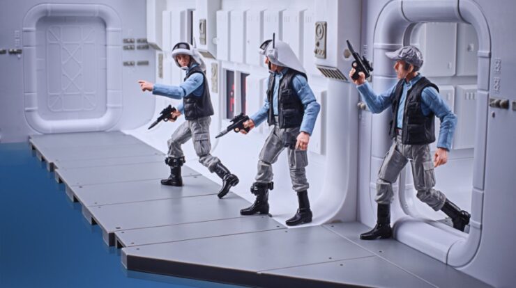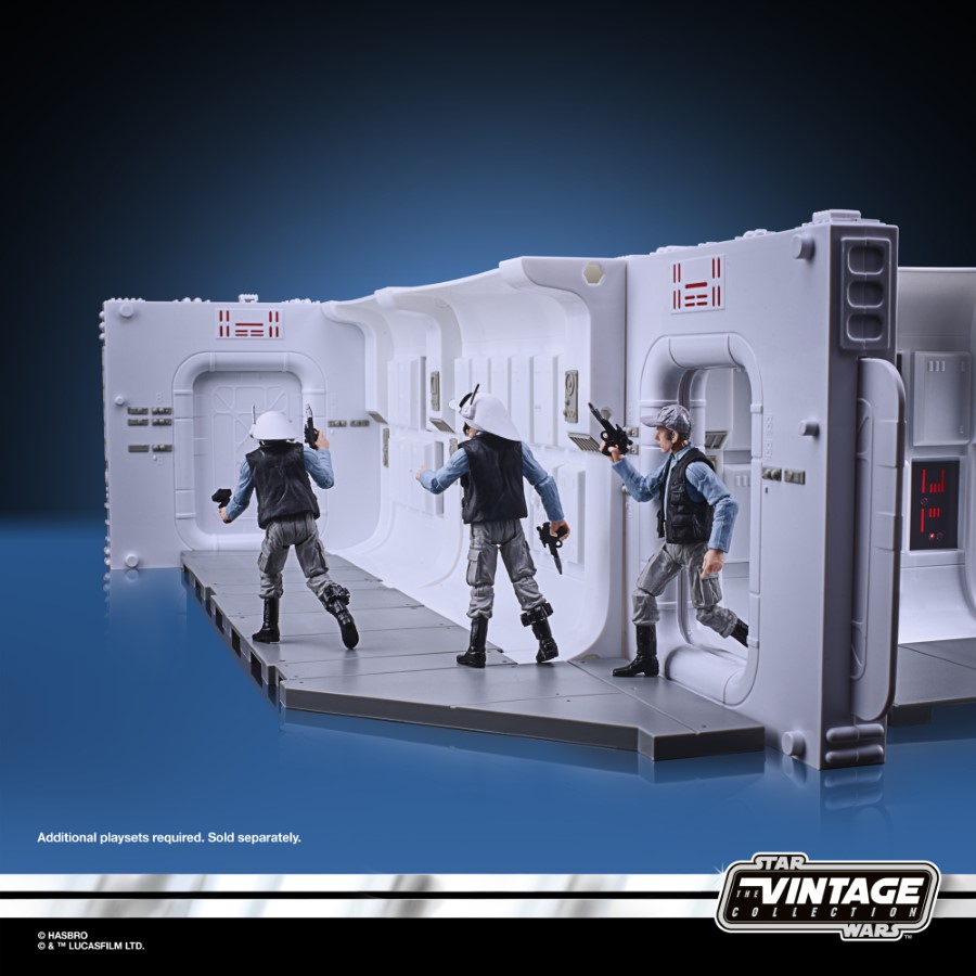 In the Vintage Collection, the show was stolen by the reveal of a new Tantive IV playset. Lifted direct from the opening scene of Star Wars (or the closing scene of Rogue One), you can now stage your own Imperial boarding of a consulate ship. The playset is modular, allowing for multiple configurations…and the back of the playset allows you to build the corridor where Leia installed the Death Star plans into R2-D2. This playset includes a vintage collection Rebel Fleet Trooper. Also announced for the Vintage Collection were an update Darth Vader on a Rogue One card and an updated ‘Galaxy’s Edge’ Hondo Ohnaka.